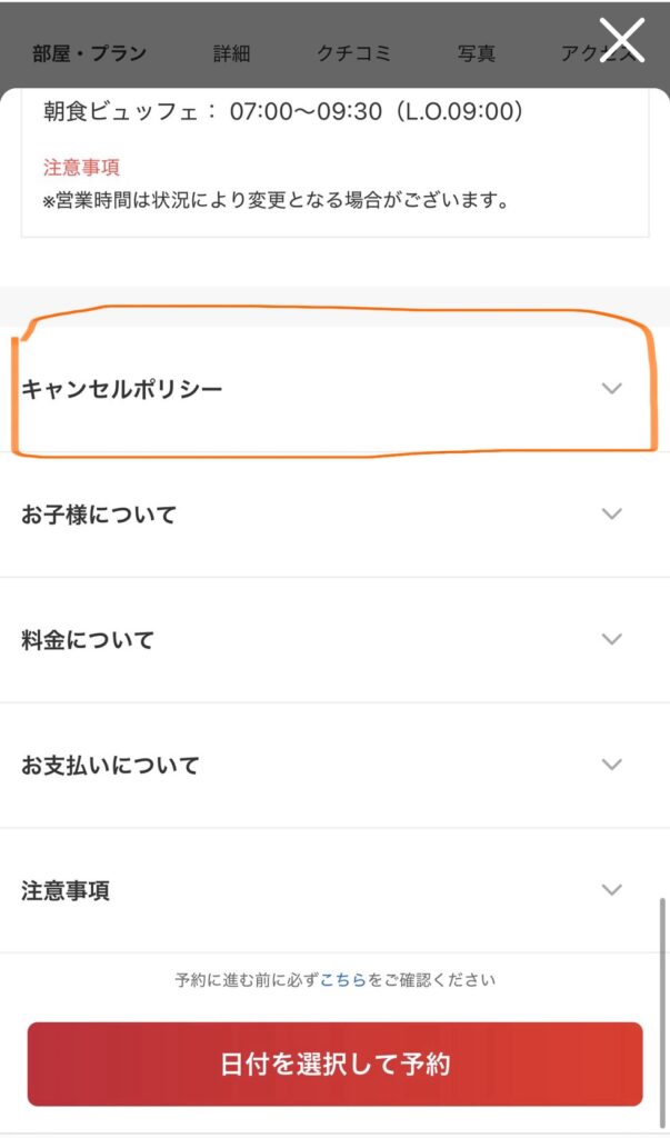 - 下にスクロールしたら「キャンセルポリシー」がるのでクリック