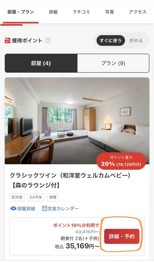 - 予約したいホテル、プランを選び「詳細・予約」を選択