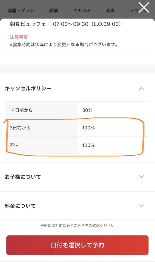 このホテルは3日前からキャンセル料100%だから